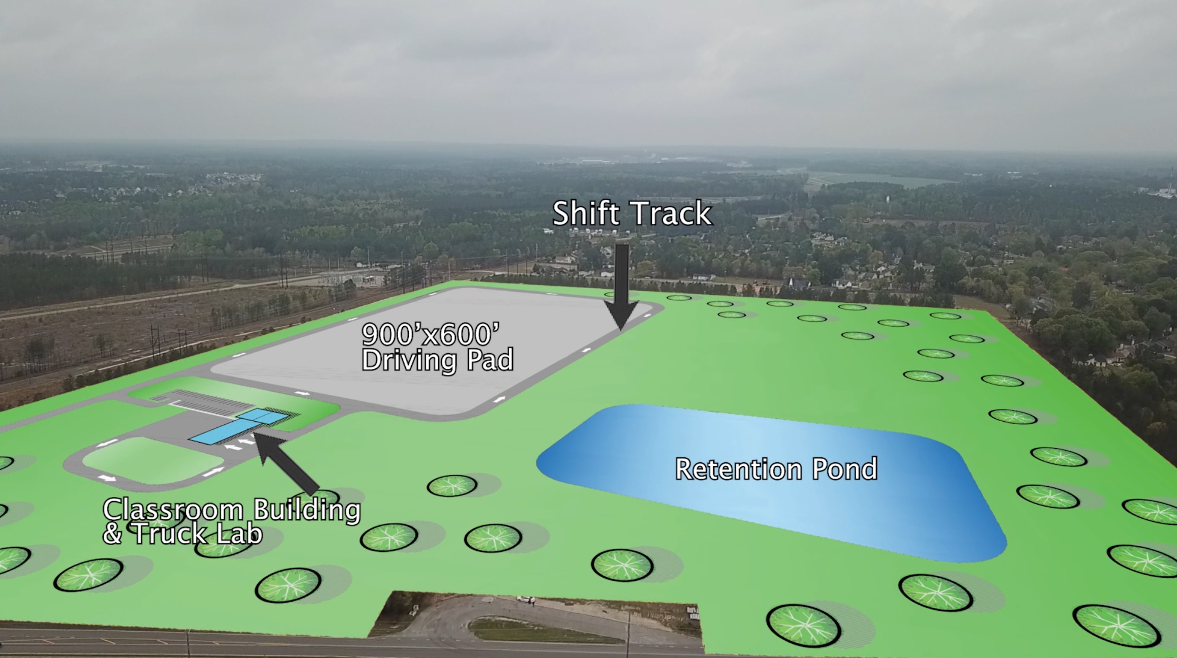 Phase I consists of a 600- by 900-foot truck pad that will provide vital training space for students in the Commercial Driver’s License Program. The 13-acre pad accommodates up to 14 tractor trailer trucks and includes a shifting track and skid area. The first phase is expected to open in December 2025.