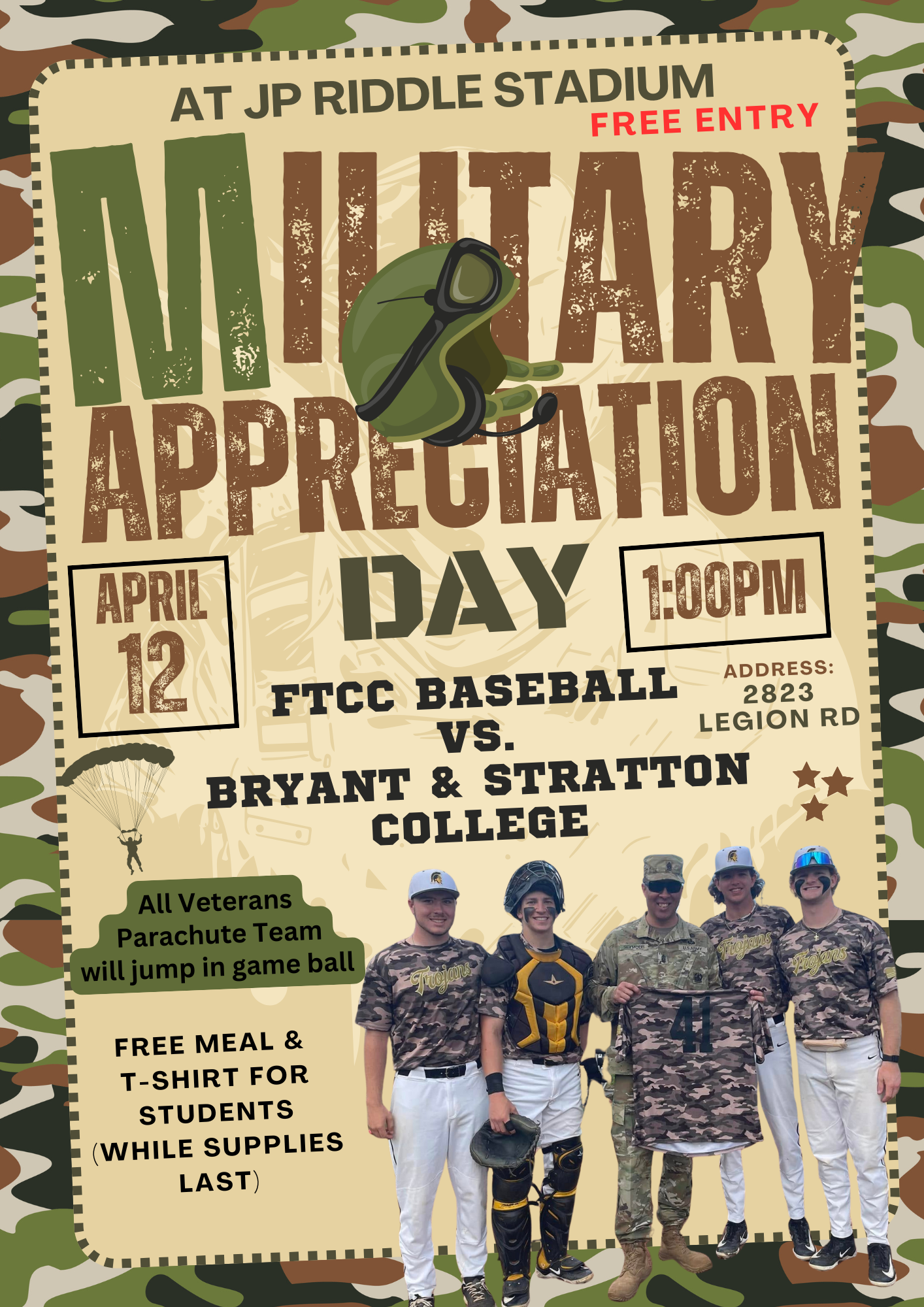 Today’s not just a great conference doubleheader against Bryant & Stratton College. It’s Military Day at J.P. Riddle Stadium. Ahead of the game start at 1pm, the All Veterans Parachute Team will jump out of a perfectly good airplane and deliver the game ball. Students will get a free meal and T-shirt (while supplies last). Come out, have fun and help FTCC Baseball honor our nation’s military. All home games are free admission and play at J.P. Riddle Stadium.