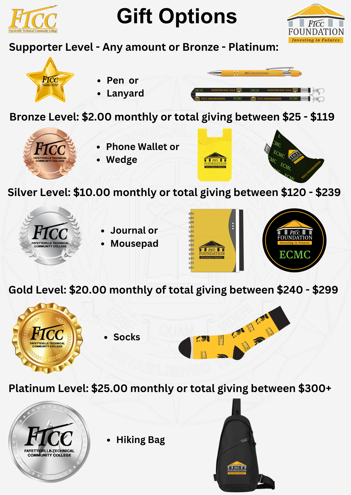 Choose from our various gift options based on your level of contribution!