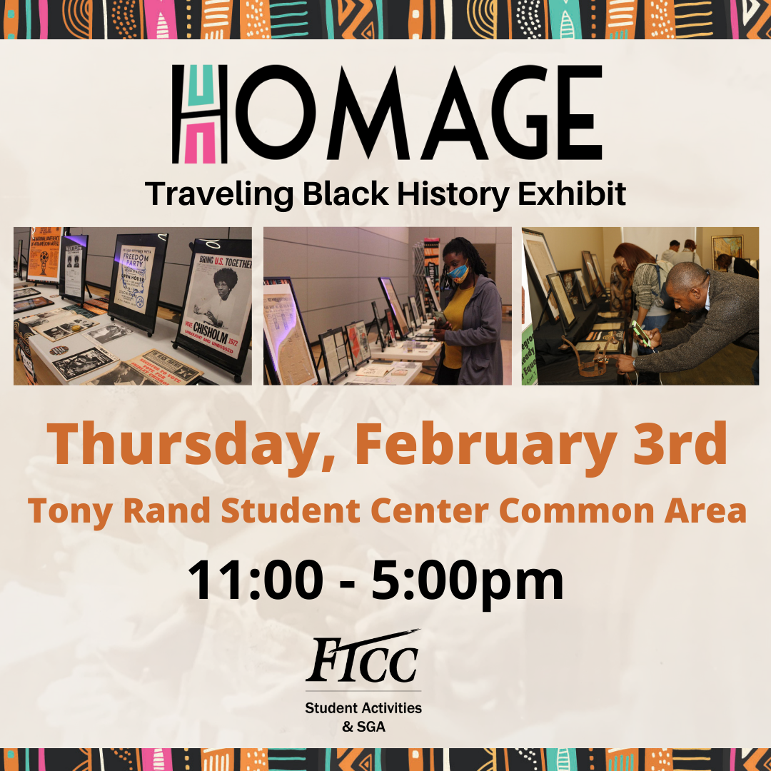 FTCC’s Student Government Association will host Homage, a traveling Black History exhibit, on Feb. 3 at the Tony Rand Student Center. The exhibit will be shown in the common area from 11 a.m. to 5 p.m.