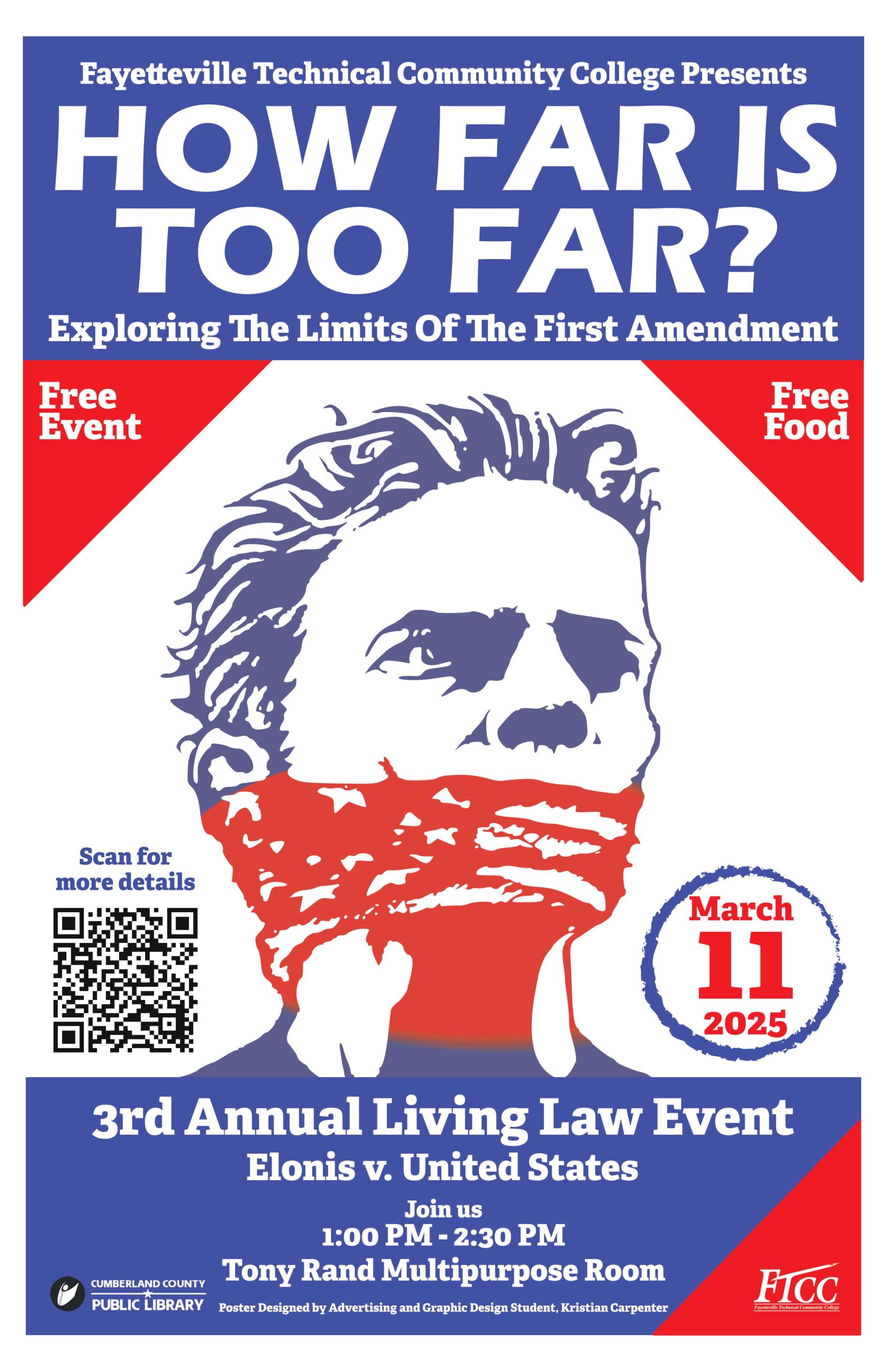 This is the third annual Living Law Project event presented by FTCC in partnership with the Cumberland County Public Library. The project examines notable court cases from the U.S. justice system to encourage community discussion and promote collaborative learning. Previously, the project explored Gonzales v. Raich, a case about the legality of medical marijuana, and Miranda v. Arizona, the landmark case that established the constitutional rights of people being arrested.